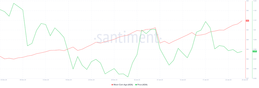 Chỉ báo Tuổi coin trung bình (Mean Coin Age) của Cardano đang tăng, báo hiệu tâm lý thị trường tích cực. Chỉ số cho biết những người nắm giữ dài hạn (LTH) đang chọn giữ lại ADA thay vì bán. Hành vi này neo giữ giá của ADA, ngăn chặn suy giảm mạnh mặc dù không có động lực tăng đáng kể trong những tuần gần đây.
