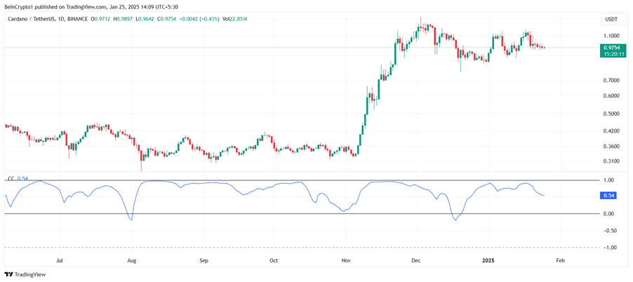 Tương quan giữa Cardano (ADA) và Bitcoin đã giảm xuống mức 0,54, làm dấy lên những lo ngại trong cộng đồng trader. Theo dữ liệu lịch sử, suy giảm tương quan như vậy thường dẫn đến những tác động tiêu cực đối với giá ADA. Việc Cardano dần mất kết nối với biến động giá Bitcoin có thể khiến nó hoạt động kém hiệu quả hơn nếu xu hướng này tiếp tục duy trì.
