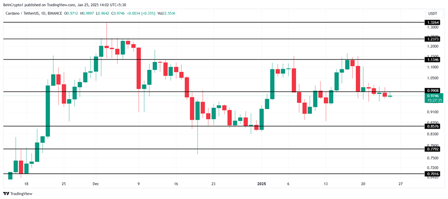 ADA hiện đang giao dịch ở mức 0,97 đô la, ngay dưới mức hỗ trợ 0,99 đô la, sau khi không thể phá vỡ rào cản 1,13 đô la. Không thể giữ được các mức quan trọng này làm nổi bật những thách thức phải đối mặt trong việc đạt được đà tăng.