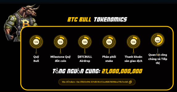 Với tổng cung 21 tỷ token, BTC Bull mang trong mình triết lý lấy cảm hứng từ Bitcoin (tổng cung 21 triệu BTC), nhưng với nguồn cung lớn hơn nhằm đảm bảo tính cộng đồng, sự bao quát và khả năng tiếp cận rộng rãi. Yếu tố này giúp dự án vừa duy trì sự khan hiếm, vừa tạo ra cơ hội cho tất cả nhà đầu tư tham gia vào một hành trình tài chính đầy hứa hẹn.