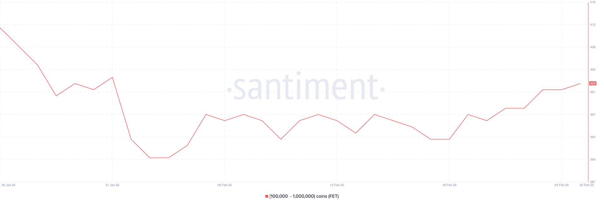 Số lượng địa chỉ nắm giữ từ 100.000 đến 1.000.000 FET đã tăng từ 394 vào ngày 18 tháng 2 lên 403 vào ngày 25 tháng 2, mức cao nhất kể từ tháng 1. Sự tích lũy này có thể tạo nền tảng cho một đợt phục hồi mạnh mẽ nếu các cá voi tiếp tục mua vào. Dù vậy, FET có khả năng vẫn chịu áp lực cho đến khi tâm lý thị trường được cải thiện.