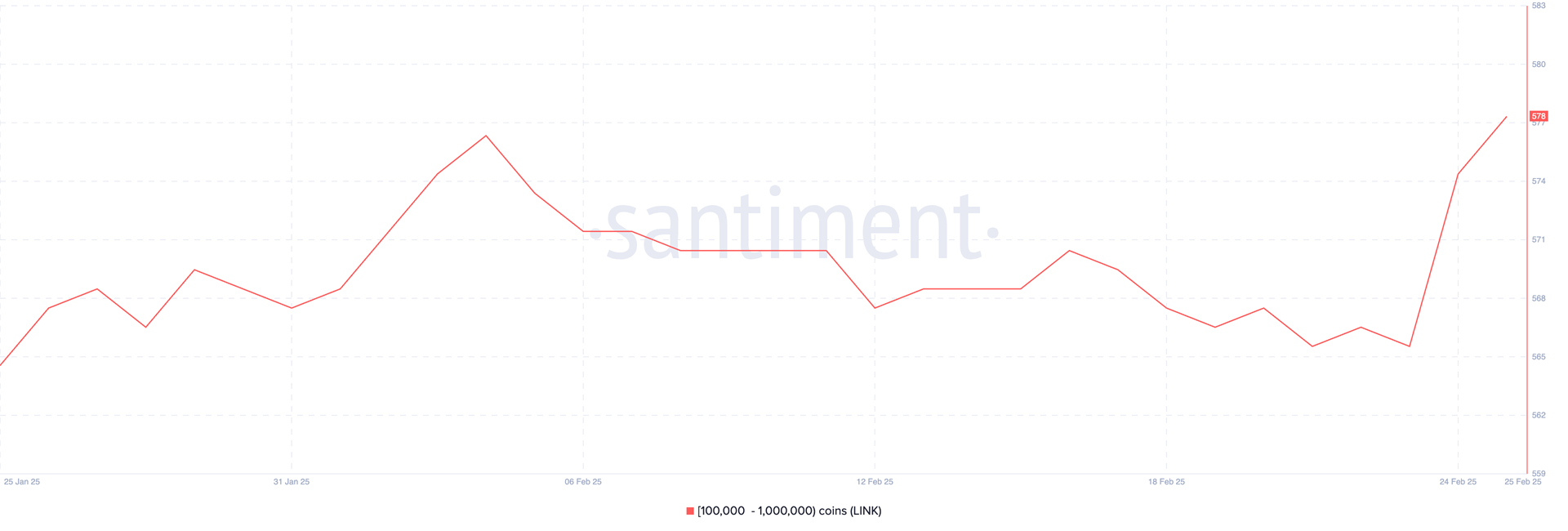 Số lượng địa chỉ nắm giữ từ 100.000 đến 1.000.000 LINK đã giảm từ 577 vào ngày 4 tháng 2 xuống còn 566 vào ngày 23 tháng 2. Tuy nhiên, số lượng này đã đảo ngược vào ngày 25 tháng 2, tăng lên 578 khi cá voi tích cực mua vào. Việc cá voi tiếp tục tích lũy LINK có thể tạo ra áp lực tăng, giúp LINK vượt qua ngưỡng kháng cự 24 USD.