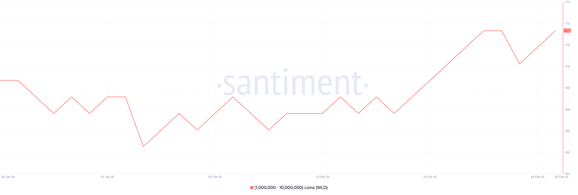 Tuy nhiên, trong khi số lượng cá voi WLD vẫn ổn định trong đầu tháng 2, từ ngày 16 tháng 2, các cá voi đã bắt đầu tích lũy trở lại. Số lượng địa chỉ nắm giữ từ 1.000.000 đến 10.000.000 WLD đã tăng lên 173, mức cao nhất kể từ tháng 12/2024. Điều này cho thấy các cá voi coi đây là cơ hội hấp dẫn để tích lũy WLD với hy vọng về một đợt phục hồi trong tương lai.