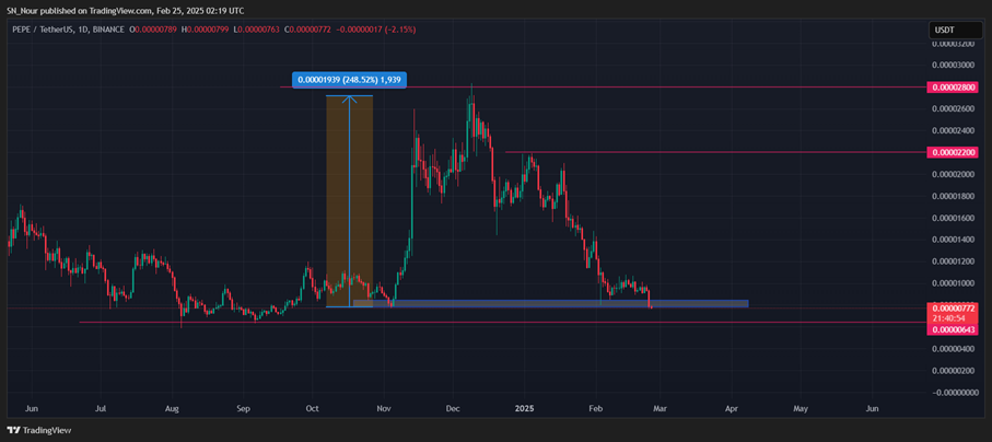 Hiện tại, PEPE đang dao động trong vùng thanh khoản bán quan trọng từ $0,00000780 – $0,00000840. Đây từng là khu vực đóng vai trò bệ phóng cho đợt tăng trưởng mạnh 248,52% vào tháng 11/2024, đưa giá lên $0,00002200.