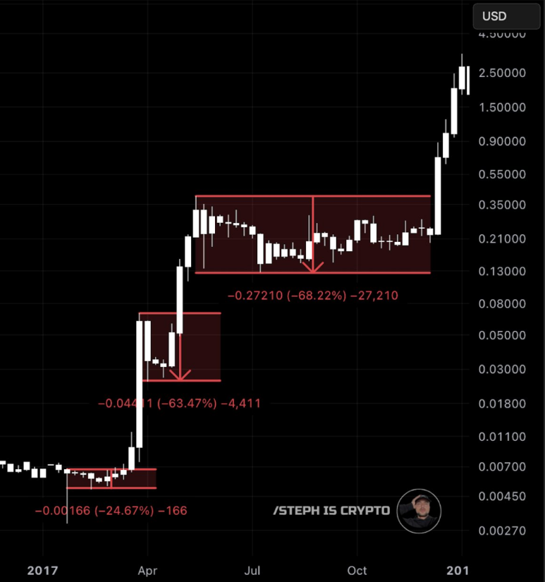 Trong khi đó, nhà phân tích Steph Crypto đã so sánh đợt giảm giá hiện tại với các đợt điều chỉnh giá năm 2017. Khi đó, XRP trải qua nhiều lần điều chỉnh với mức giảm lên đến 68% trong suốt chu kỳ tăng giá trước khi đạt mức cao nhất lịch sử.