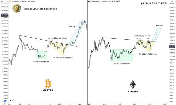 Hành vi chu kỳ hiện tại của ETH phản ánh chặt chẽ chu kỳ trước của Bitcoin ngay trước khi đột phá và tăng mạnh.