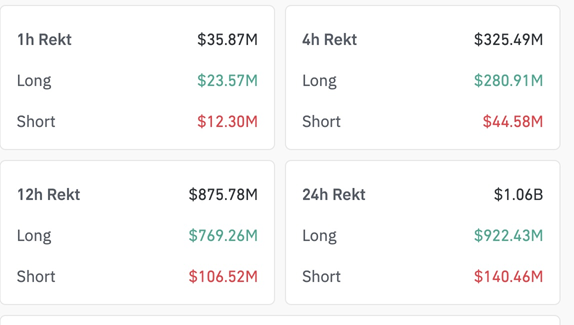 Dữ liệu từ CoinGlass cho thấy, tổng giá trị các vị thế hợp đồng tương lai tiền điện tử bị thanh lý đã vượt 1 tỷ USD trong 24 giờ qua, trong đó ETH dẫn đầu với 240 triệu USD bị thanh lý, còn BTC là 200 triệu USD thanh lý.