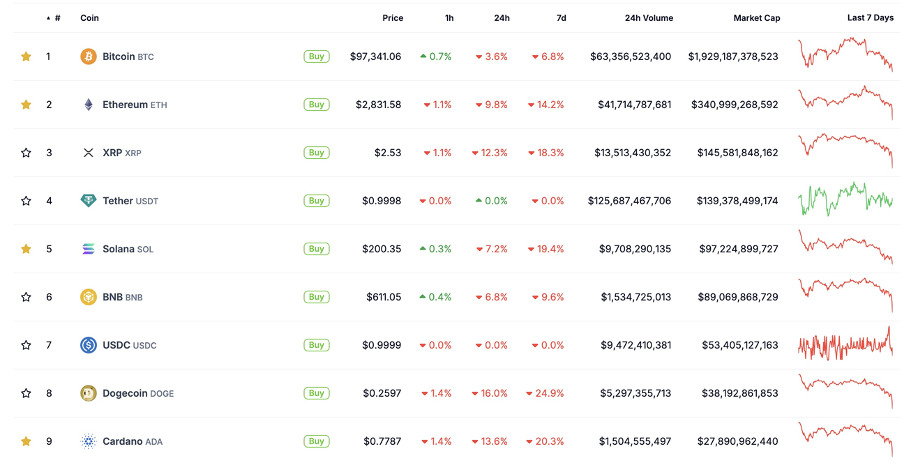 Top những đồng coin lớn nhất thị trường giảm giá mạnh | Nguồn: Coingecko