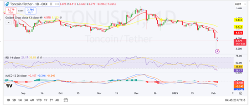 Chỉ số sức mạnh tương đối (RSI) đang ở mức 21.17 – vùng quá bán, cho thấy TON có khả năng bật tăng nếu lực mua xuất hiện. Trong khi đó, chỉ báo MACD vẫn trong xu hướng giảm, với đường MACD nằm dưới đường tín hiệu và histogram duy trì trạng thái âm.