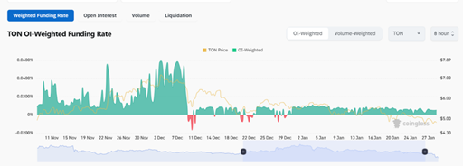 Sau khi đạt đỉnh $7.89 vào đầu tháng 12, giá Toncoin đã giảm đáng kể, kéo theo Funding Rate suy giảm, cho thấy thị trường chịu áp lực thanh lý và thiên về xu hướng giảm.