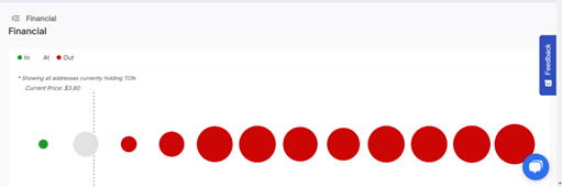 Chỉ một số ít nhà đầu tư đang có lãi, tức là họ đã mua TON ở mức giá thấp hơn hiện tại. Trong khi đó, những trader có giá vốn gần $3.80 – thể hiện qua bong bóng màu xám trên biểu đồ – đang ở mức hòa vốn.