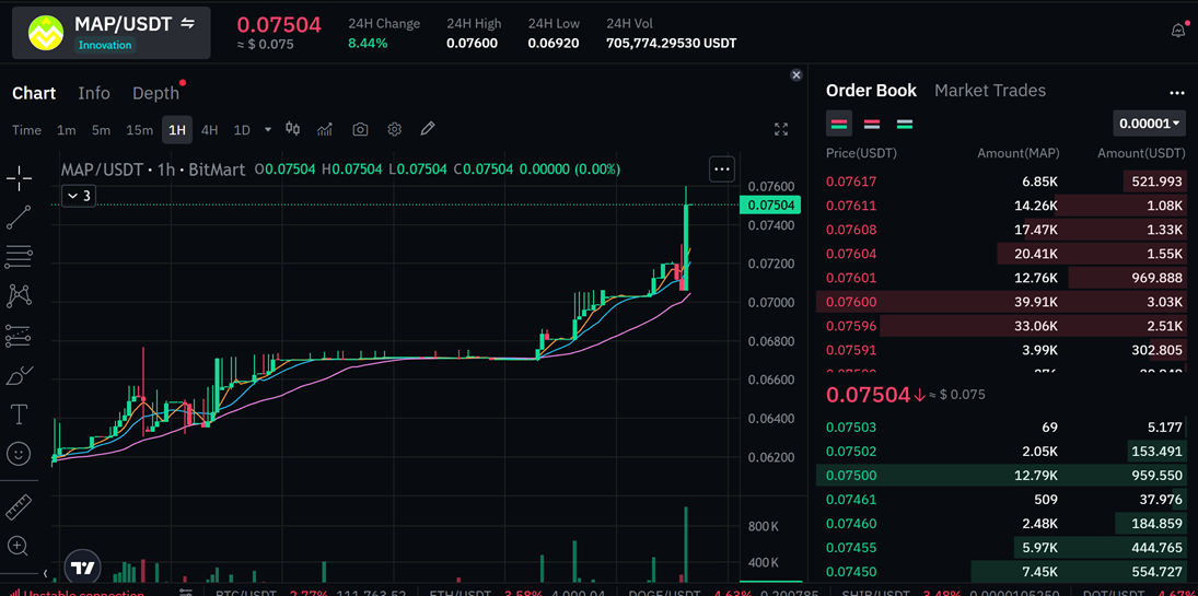 Thị trường tiền điện tử đang chứng kiến một làn sóng phấn khích lan tỏa mạnh mẽ, khi MAP/USDT vừa tạo nên cú bật giá ấn tượng, vươn lên 0.075 USDT, tăng 8.44% chỉ trong 24 giờ. Đây không chỉ là một đợt tăng giá thông thường, mà là tín hiệu khởi đầu cho chu kỳ tăng trưởng bền vững của hệ sinh thái MapNode.