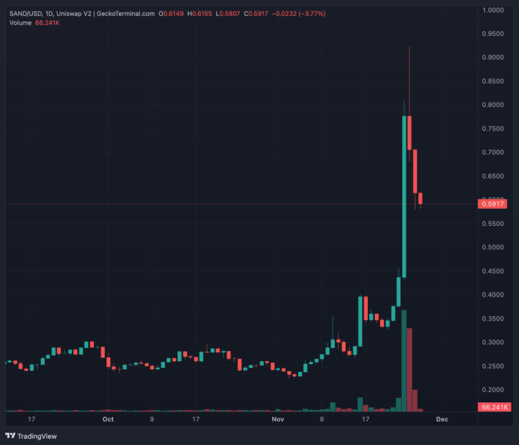 Một dự án metaverse khác cũng có sự tăng trưởng mạnh mẽ trong tháng 11 là The Sandbox. Token SAND đã tăng hơn 140%, đưa SAND trở thành một trong những token metaverse hàng đầu theo dữ liệu từ CoinGecko.