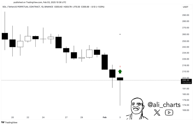 Nhà phân tích Ali Martinez đã đăng trên X giải thích cách các điểm đảo chiều của Solana có liên kết với chỉ báo này theo dữ liệu lịch sử. Một mũi tên xanh cùng số “9” xuất hiện trên biểu đồ hàng ngày, báo hiệu khả năng thay đổi xu hướng giá, tương tự như các lần trước khi SOL phục hồi từ các tín hiệu này.